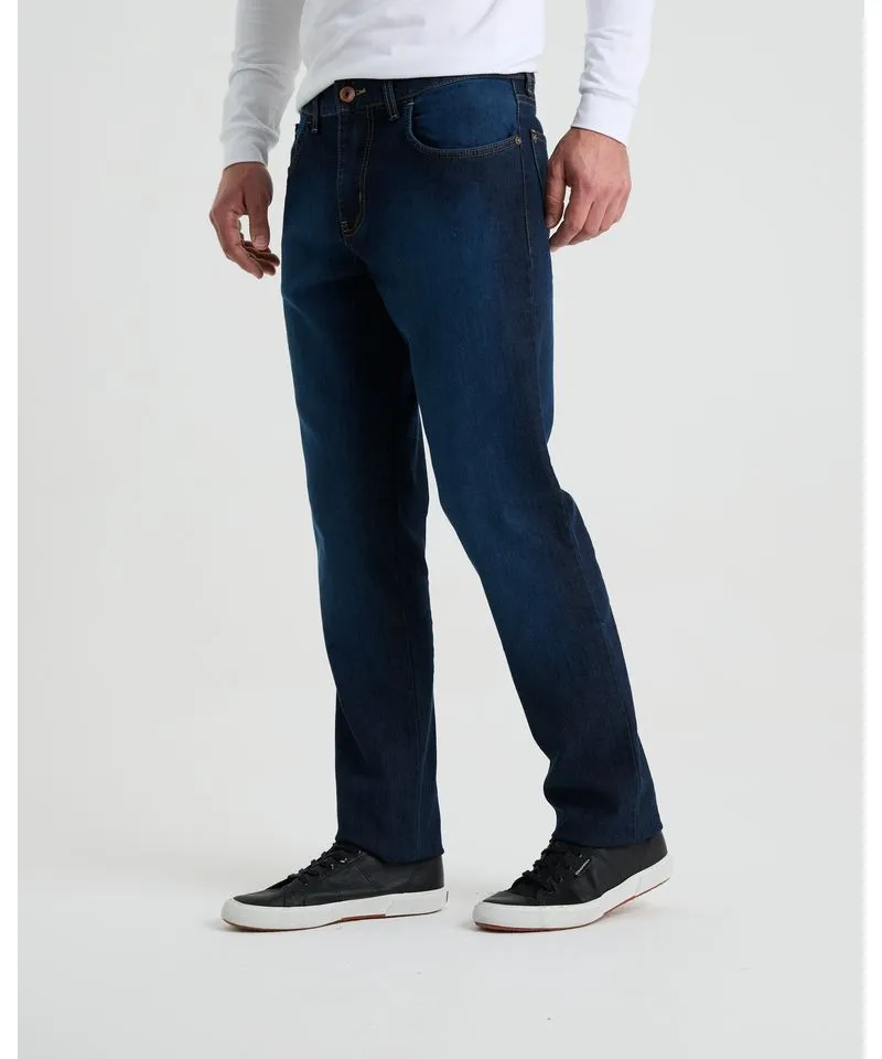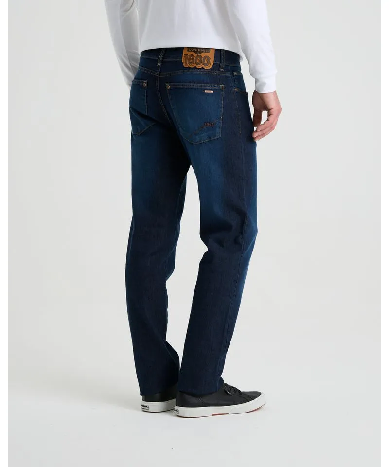 Jean tiro medio, calce regular con cinco bolsillos y bordado 1800. Serie 1800